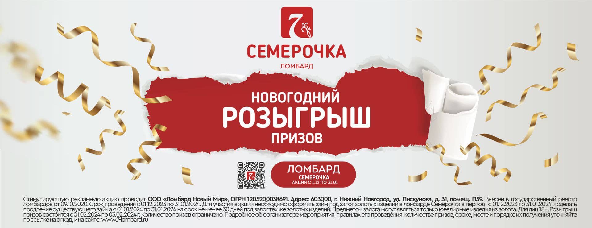 Новогоднее чудо от ломбарда «Семерочка»! Участвуйте в новогоднем розыгрыше призов с 1 декабря по 31 января. Подробную информацию узнавайте по телефону горячей линии или у сотрудников ломбарда.